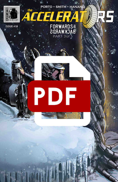 The all-new story arc of The Accelerators continues with the return of...The Face! In the 88th Century, our heroes escape from the monstrous time worms, and arrive at the Spire, a massive tower that stretches upward into infinity. This is where they've been heading all along...could it finally be their way home? Lucky for everyone, The Face is there to answer their questions, and to keep the time worms at bay. Meanwhile, Spatz has a story to tell...
